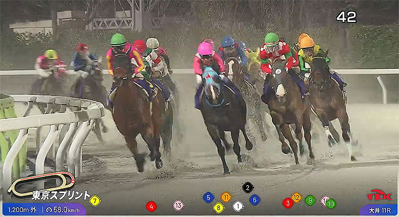TCK 競走馬トラッキングシステム は、競走馬のスピードやポジションなどを、レース映像にリアルタイムでグラフィック表示してくれて、レースのリアル状況がよりわかりやすく、直感的に観戦できる。
