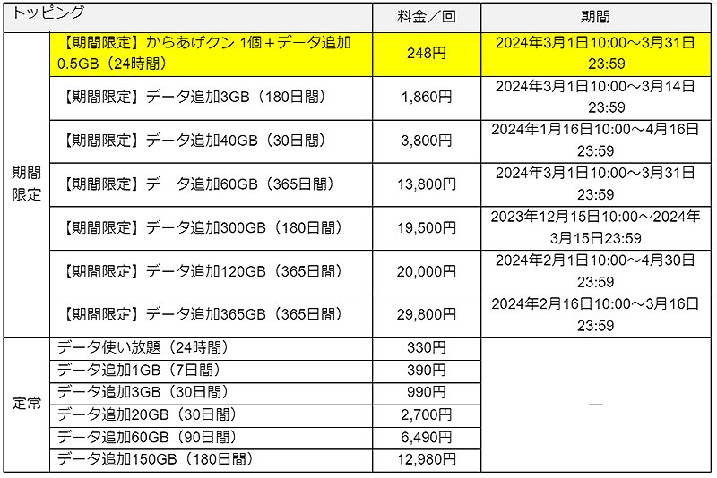 povo2.0 の「0.5GB(24時間)」と、ローソンの「からあげクン」1個(248円相当)がセットになったトッピングが、3月31日まで248円!