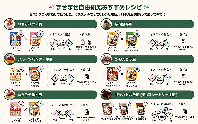 また、開発したレシピは「まぜまぜ研究証明書」に記載し、レシピを記録できるから、この機会にバリエーション豊富な「ごろグラ」と「シスコーン」をまぜまぜして、あなただけのオリジナルレシピを発見してみて。