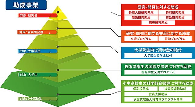 2014年以降は、若手人材育成のため、大学院生向け奨学金や大学生の短期留学サポート、さらにすそ野拡大のため、小中高校生を対象とした科学教育振興助成など、幅広い層への支援を実現している。