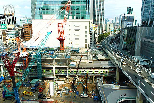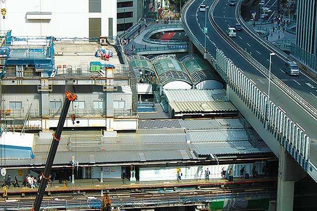 画像右奥、首都高の左下にある蒲鉾(カマボコ)型の建屋が、地上時代の東急東横線 渋谷駅 ホーム構造空間。