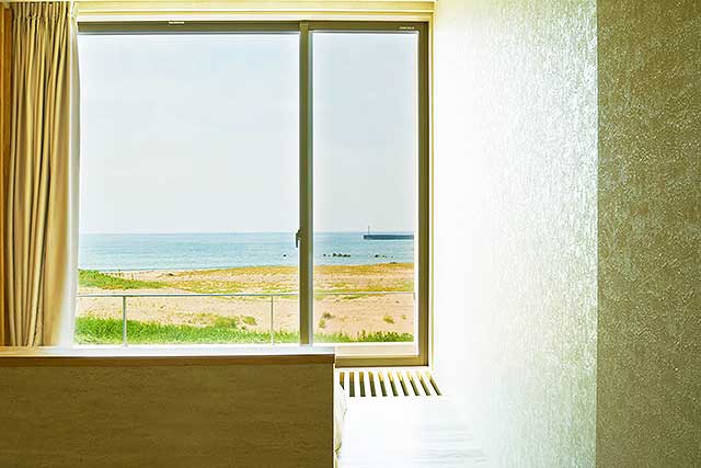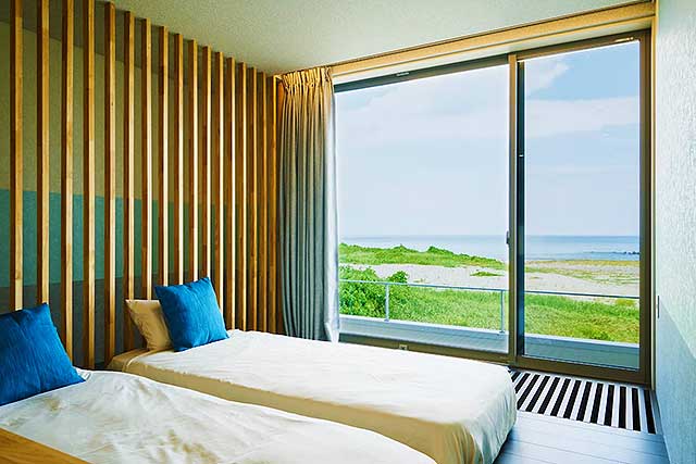 最大の特徴は、寝室の心身を癒す、プレミアムな寝心地のマットレスを使用した、ツインベッドから一望できる壮大な水平線と静かな港町。