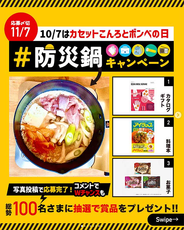 そこで、日本ガス石油機器工業会 Instagram公式アカウントでは、10月7日~11月7日の1か月間、期間中に防災鍋を実際につくった写真を投稿した人の中から、抽選で100人にプレゼントが贈られるというから、みんなで防災鍋をつくってカセットボンベの使い方を理解し、使用期限を確認しよう↓↓↓