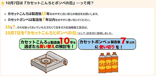 日本ガス石油機器工業会は、「製造から【10】年以上経過している『カセットこんろ』、製造から【7】年以上経過している『カセットボンベ』」の買い替え時期にあわせて、10月7日を「カセットこんろとボンベの日」と制定し、この時期に「被災時を想定して」、カセットこんろ・ボンベを使ってつくる「防災鍋」をつくり、カセットこんろ、カセットボンベの使い方を理解し、使用期限を確認することを推奨している↓↓↓