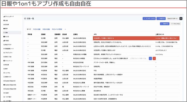 さらに、日報や1on1、アプリ作成、画面レイアウト、ダッシュボードも自由にカスタマイズできるのがうれしい。