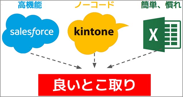 誰でも使ってる Excel(エクセル)の入力操作をそのままに、「操作はエクセル、編集は Kintone、機能は Salesforce」といった使い方が実現する。