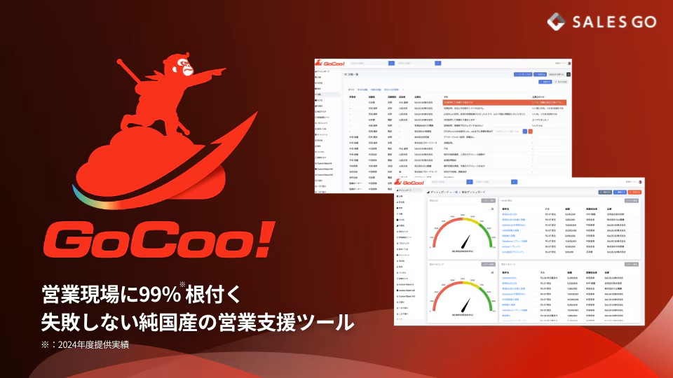 この「GoCoo!」は、Excelライクな見た目やノーコードでカスタム可能な使いやすさに加え業界最安水準の価格が特長の、日本企業に最適化された 純国産 SFA 。