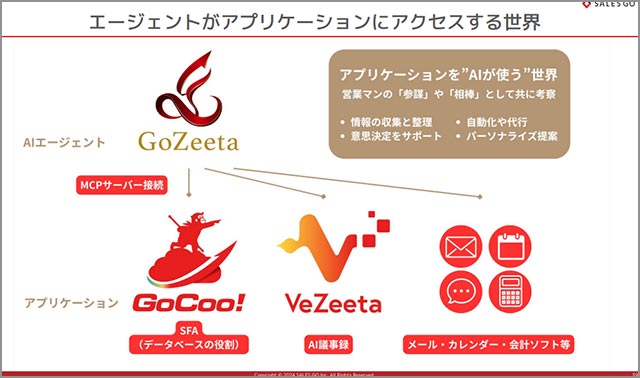 日本初 MCPサーバー(Model Context Protocol:AIと外部サービスを橋渡しする中間サーバー)接続で AI連携できる次世代インテリジェントSFA(営業管理システム)「GoCoo!(ゴクウ)」、スマート AI議事録「VeZeeta(ベジータ)」、セールス AIエージェント「GoZeeta(ゴジータ)」と、次々と発表した SALES GO 内山雄輝 代表取締役社長、石井賢 取締役副社長COO/CPO、孟祥梁 執行役員CTO に、これら最新サービスの特長と強みを聞いた。