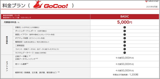 GoCoo! は、Salesforce と同等の高機能が約1/4の月額5000円で利用可能。