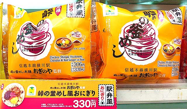 ―――「荻野屋 峠の釜めし風おにぎり」は、首都圏、静岡・長野・宮城・福島・山形・岩手の各県内・新潟駅の NewDays などで 330円で販売中↓↓↓