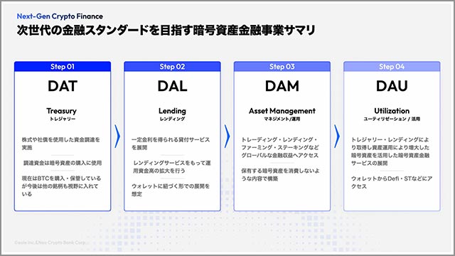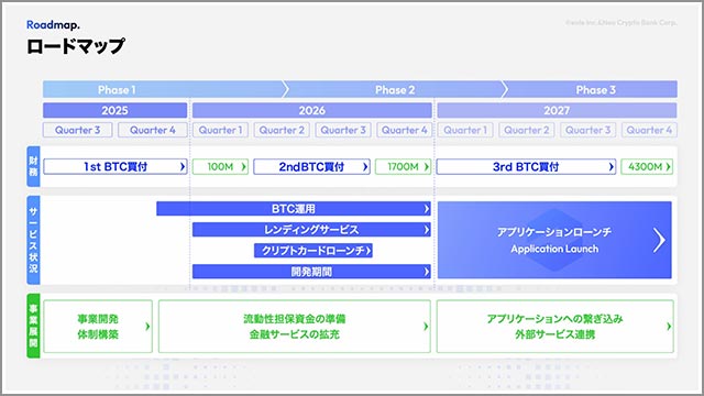 「2025年内に120〜160億円規模のビットコイン取得を目指していく」とし、さらにビットコインを取得していきながら、暗号資産トレジャリー&レンディングで、新たな財務基盤を構築し、新たな金融プラットフォーム「Neo Crypt Bank構想」実現へ前進させる。