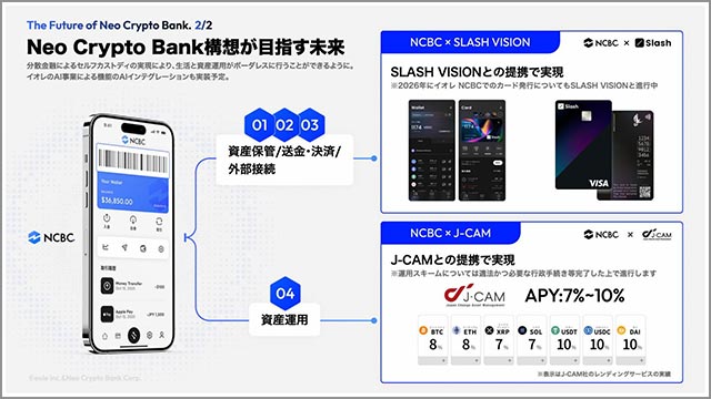 Slash Card は従来のカードとは異なり、利用者が自己保有する暗号資産やステーブルコインを決済に利用できる「次世代金融カード」で、イオレとの提携によって Neo Crypt Bank 構想実現へ向けて加速するエンジンになる。