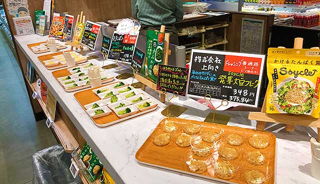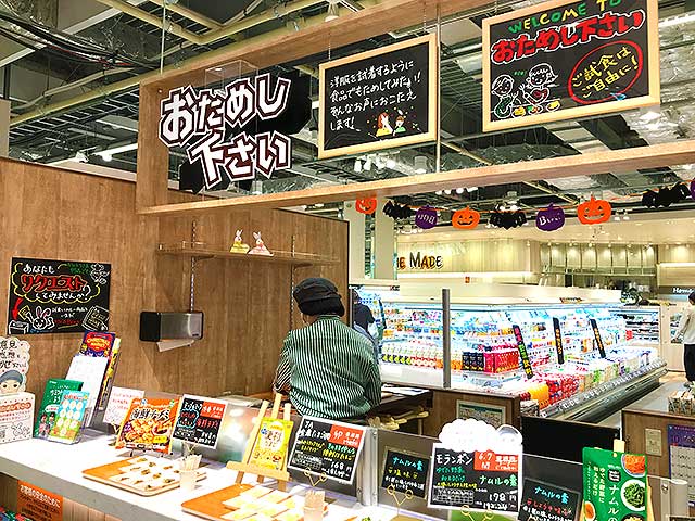 ここは調味料やドリンクなどの新商品のお試しコーナーで、サミットバイヤーいち推し商品や、新しい食べ方の提案など、店員と気軽に話せる場にしてる。