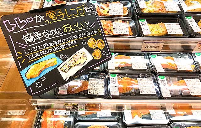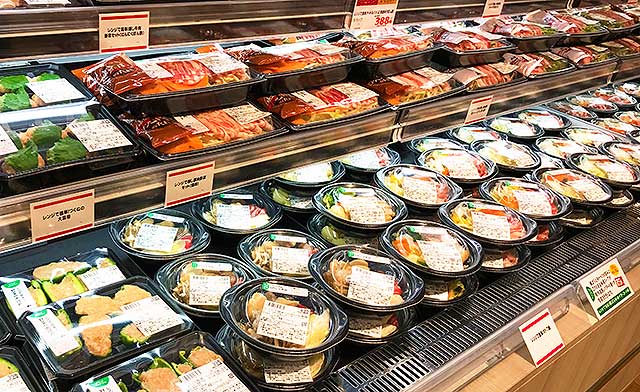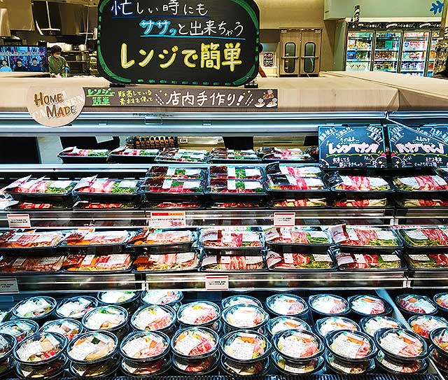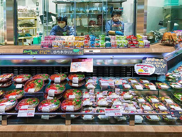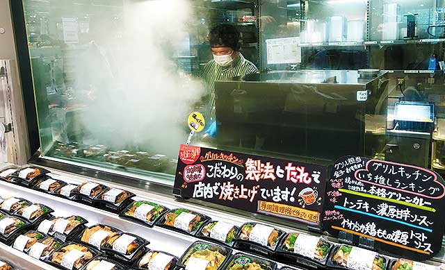 サミットストアは、平置き陳列棚の奥に、ガラスの向こう側でおいしい料理をつくるライブキッチン(対面販売)がある。