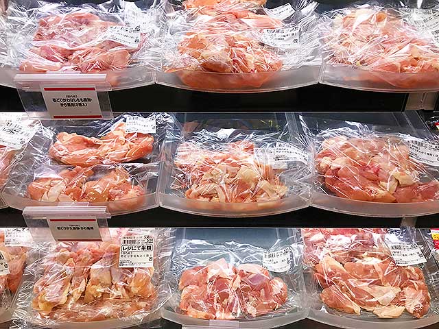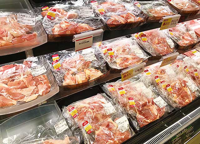 ↑↑↑トレーを使わずビニールで販売している鶏肉。そのまま冷凍庫に入れて冷凍保存もできるし、かさばるゴミも削減できて、環境にもやさしい。