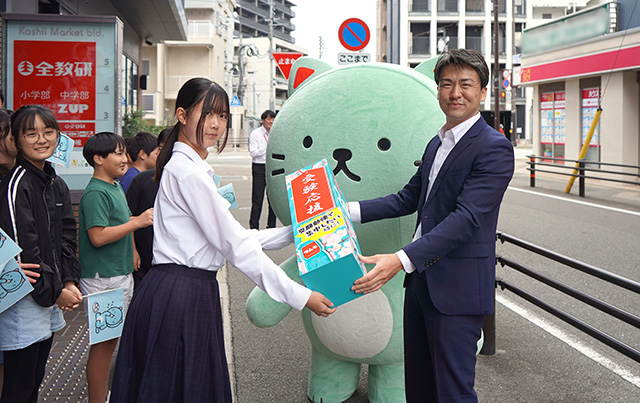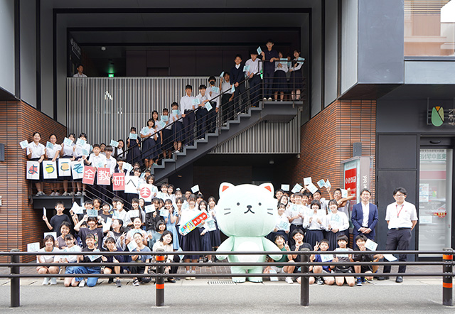 北部九州を中心に 81教室を展開する学習塾「全教研」の香椎本部教室に「ラムねこ」が特別出張し、受験生たちに直接「森永ラムネ」を手渡して、大盛りあがり。