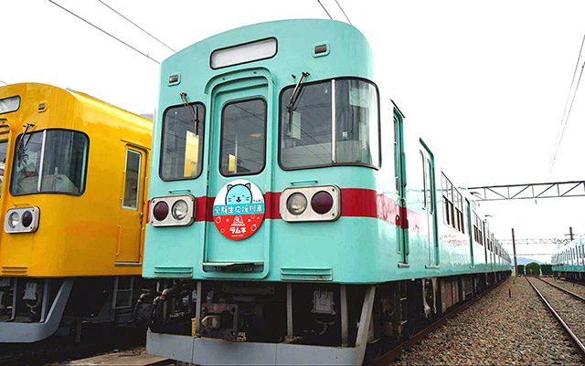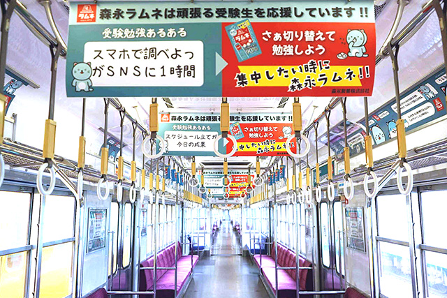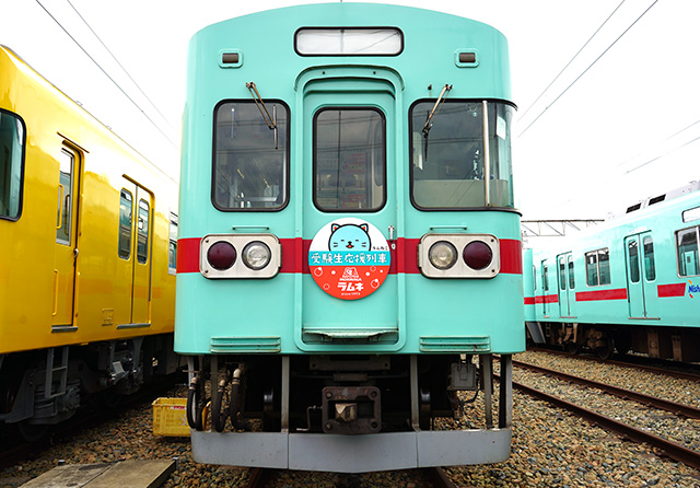 そして太宰府天満宮へのアクセスといえば西日本鉄道(西鉄電車)ってことで、「ラムネ色の西鉄電車」に ラムねこヘッドマーク や 車内応援中吊りメッセージなどで受験生を応援する「受験生応援列車」が爆誕!