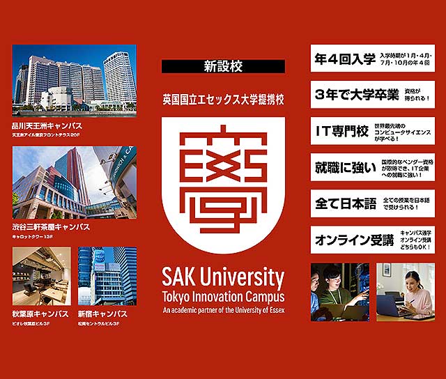 もともと SAK は東京で開校22年、これまでに1万6000名以上の生徒数、法人顧客400社以上を持つ IT専門スクールで、この SAK とエセックス大学がかけ合わさり、名門エセックス大学の学士号と大学院課程(Postgraduate Programme)の学位を、日本国内ですべて日本語で学び、正式に授与される日本初の学校として注目を集める。