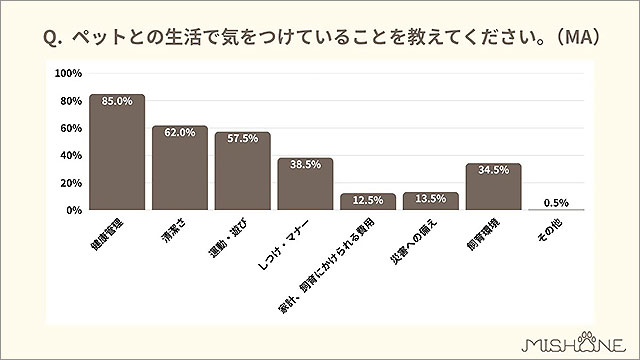 ペットとの生活で気をつけていることは、健康管理(85.0%)、清潔さ(62.0%)、運動・遊び(57.5%)の順で多い結果に。