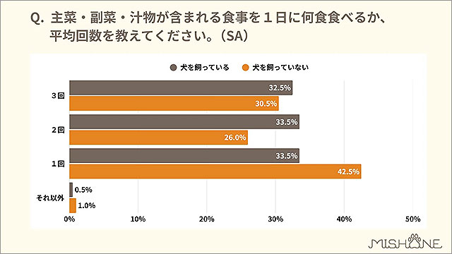 食生活においては、主菜・副菜・汁物が含まれる食事の1日の平均回数を調査した結果、ペットを飼っている人と飼っていない人では1回と回答した人に9ptの差がでた。