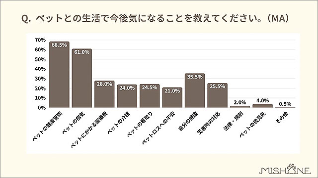 ペットとの生活で今後気になることとしては、ペットの健康管理(68.5%)、ペットの病気(61.0%)に対する意識が高く、差が開いて次に自分の健康(35.5%)という結果に。