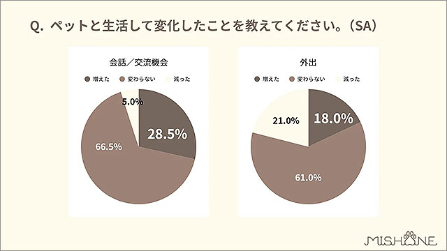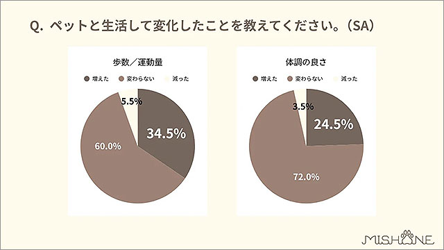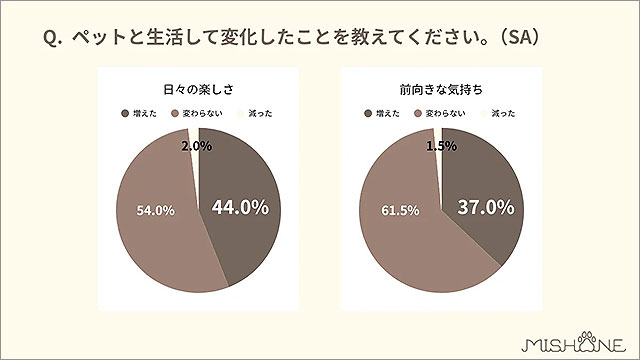 ペットと生活して変化したことは、日々の楽しさ(44.0%)、前向きな気持ち(37.0%)などの気持ちに対する変化を感じている人が多かった結果に。