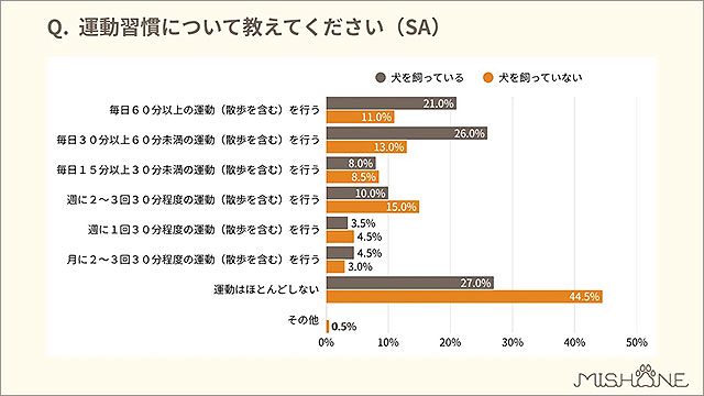 それと比較し、ペットを飼っている人でほとんど運動をしないと回答した人は27.0%に留まる結果に。