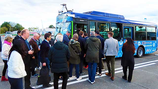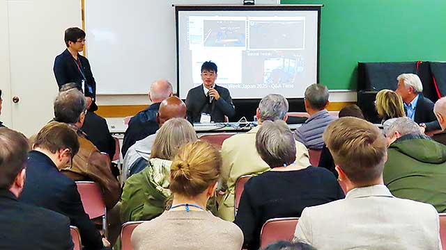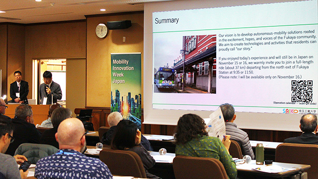ドイツ・フランスなどの欧州圏、カナダ・アメリカなどの北米、アジア圏からの研究者・開発者など50人を超える一団が埼玉工業大学を訪れ、自動運転で運行している路線バスの路線を含む一部区間に試乗し、「既存の路線バス車両に自動運転AIシステムを後付けするソリューション」を体感した。