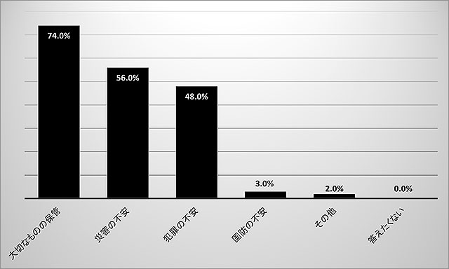 金庫の購入を検討している人に理由を聞くと「災害の不安(56.0%)」や「犯罪の不安(48.0%)」があげられ、防災・防犯意識による金庫への注目が集まっている。