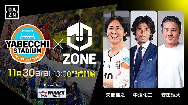 「大接戦のJ1優勝争いスコア予想で#Jみようぜ」がテーマの「やべスタ×JZONE Powered by WINNER 」は、スポーツくじ「WINNER」のスコア予想と連動させ、「やべっちスタジアム」MC 矢部浩之、アシスタント黒木ひかりに加え、試合の解説とスコア予想を行うゲストに中澤佑二・安田理大を迎え、J1の優勝争いに絡むカードをチェックしながらスコア予想と合わせて熱戦が楽しめる。