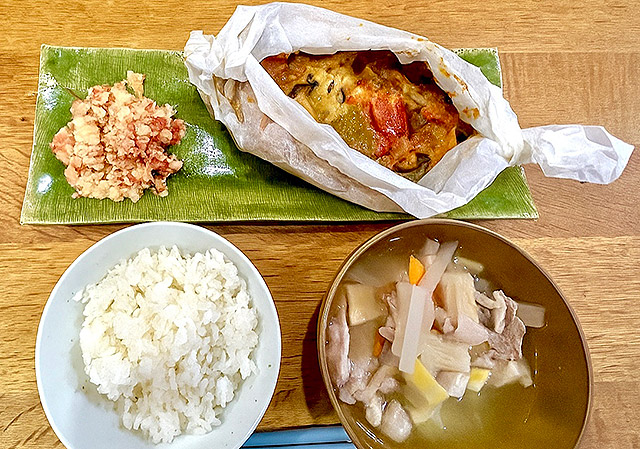 塩分が多い「朴葉味噌」を、味噌の量を減らしてトマトピューレを加えることで自然な酸味と深みを出し、満足感と減塩を両立させた。