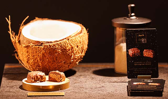 キャラメリゼしたココナッツ片入りのアーモンドプラリネフィリングをミルクチョコレートでコーティング。クセのないすっきりとしたココナッツ風味。