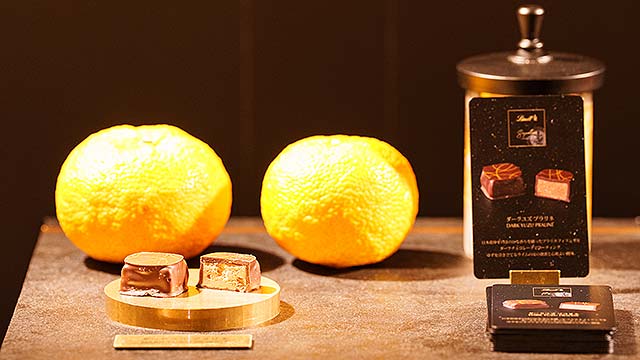 日本産ゆずのほのかな香りを纏ったプラリネフィリングをダークチョコレートでコーティング。ゆずを引き立てるライムの皮の食感と心地よい酸味。