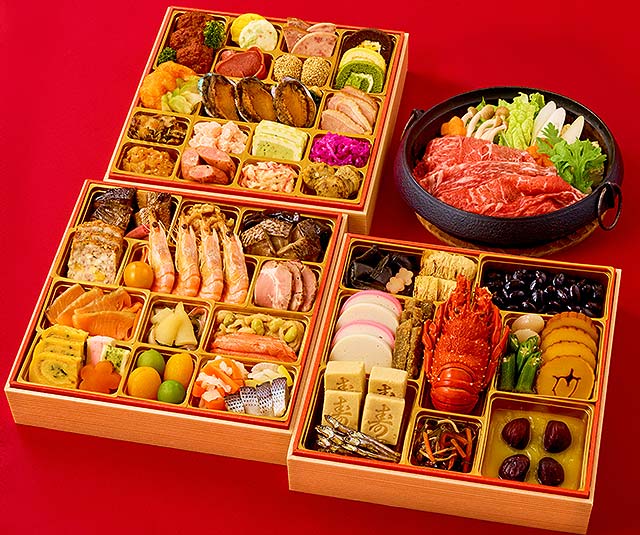 内容 : 和の重は、伝統的なおせち食材と、こはだかぶら和えや柔らかく炊き上げた白花豆煮。洋の重は、十勝ハーブ牛ローストビーフやロブスター。中華の重は、豚を黒糖で仕上げたローストポークと鮑煮が入った豪華なお重となっております。