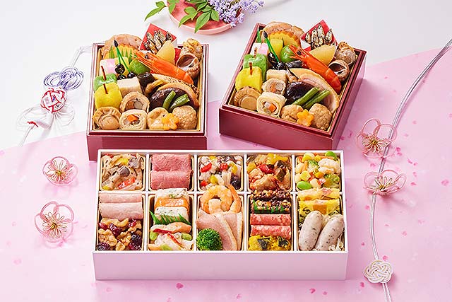 多彩な味わいの和洋中三段重に、鮑(あわび)や和牛ローストビーフ、愛知みかわ豚の黒酢酢豚などプレミアム食材をふんだんに盛り込みました。