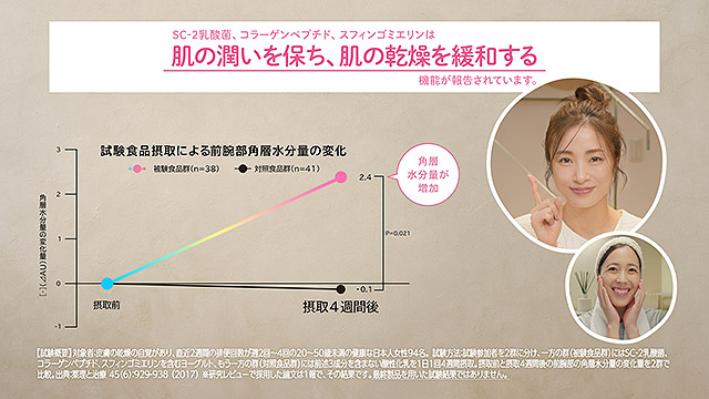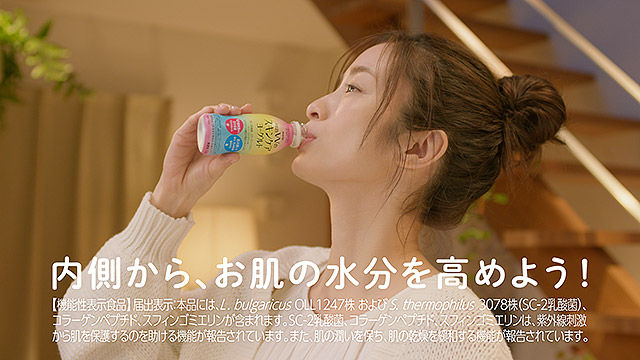 CM では、SC-2乳酸菌、コラーゲンペプチド、スフィンゴミエリンの働きによる研究報告にもとづき、肌の潤いを保ち、肌の乾燥を緩和する機能が報告されている「明治Wのスキンケアヨーグルト」の特徴を伝えている↓↓↓