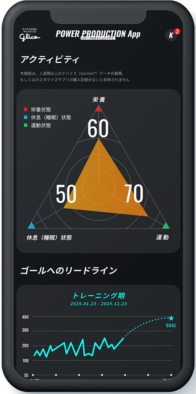 グリコ「パワープロダクションアプリ」は、アスリートのコンディションとパフォーマンスを「見える化」し、理想のゴールに向けて伴走する新しいトレーニングアプリ。