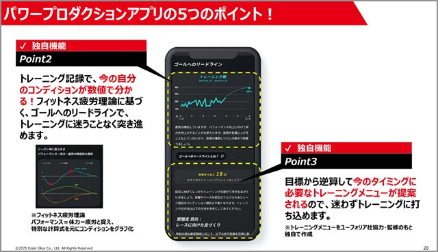 グリコ「パワープロダクションアプリ」で注目の機能は、「アスリートコンディションチェック」「Garmin デバイス連携」「ゴールへのリードライン」の3機能だ。