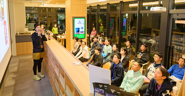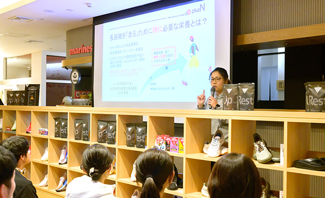 ランの前に、日本スポーツ協会・日本栄養士会公認スポーツ栄養士、小嶋理恵子先生のレクチャーから。