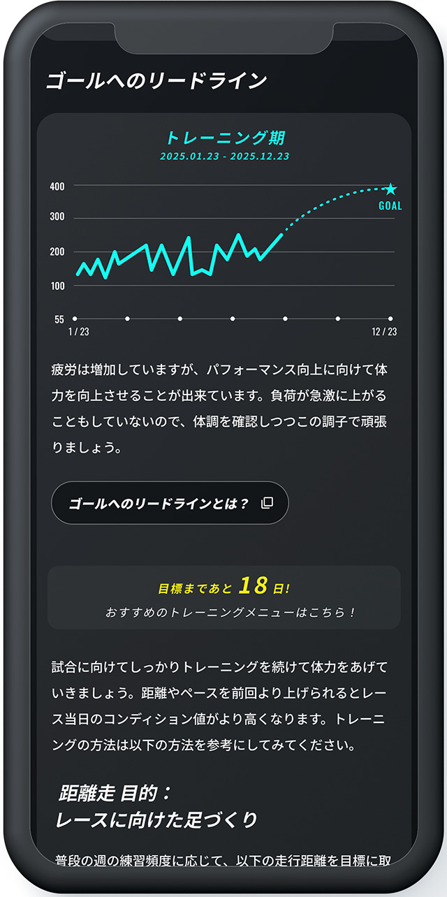 さらにグリコ パワープロダクションアプリ「アスリートコンディションチェック」は、目標とする大会を設定すると、現在地と進捗がグラフで可視化される「ゴールへのリードライン」機能を搭載。