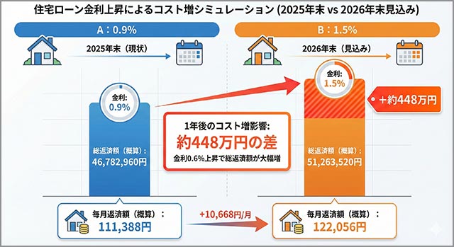 変動金利がわずか1年間で0.6ポイント(0.9%から1.5%へ)上昇するだけで、35年間の総返済額に約448万円もの差が生じます。