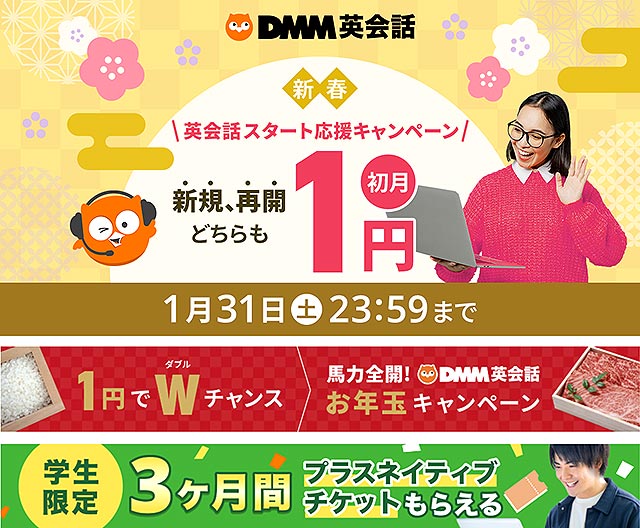 オンライン英会話サービス DMM英会話「新春英会話応援スタートキャンペーン」は、1月1日から1月31日の1か月間にスタンダードプランまたはプラスネイティブプランに新規入会・再入会すると、初月の月額料金が1円に。