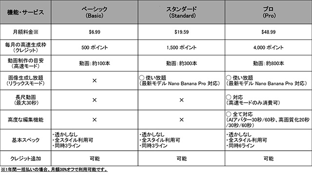 いずれもクレジット制を採用し、「スタンダードプラン」「プロプラン」では「リラックスモード」によりクレジット消費を抑えて利用できるのもポイント。
