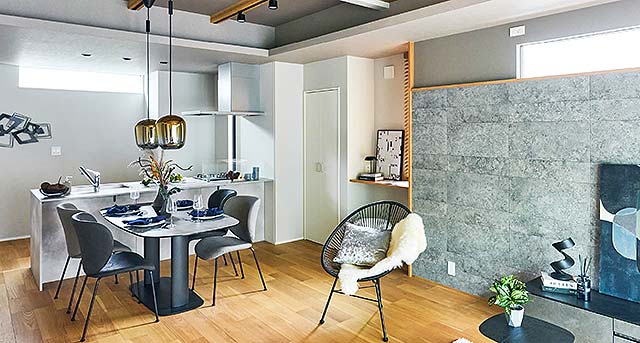 キッチンは空間と一体化し、自然素材を再現したアクセントタイルが温かみを添えている。