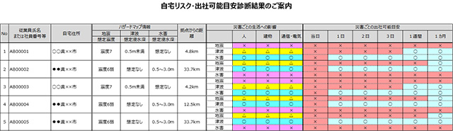 ◆自宅リスク・出社可能目安診断:従業員の住所情報から、a)従業員の自宅の地震・津波・水害のハザードマップ情報、b)拠点までの距離、c)前記ab情報を踏まえた生活への影響や出社可能な目安を一覧化。