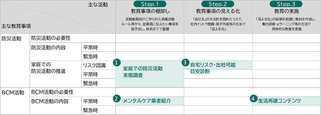 従業員教育推進モデルを「教育事項の棚卸し」「教育事項の見える化」「教育の実施」の 3Step として整理し、個別に提供してきたMS&ADインシュアランスグループ MS&ADインターリスク総研は、企業の従業員教育の強化に向けて提供している「防災・BCMに関する従業員教育支援サービス」を拡充。