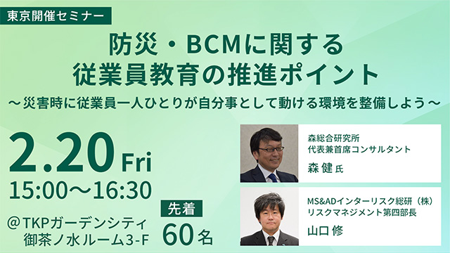 【2/20東京開催】防災・BCMに関する従業員教育の推進ポイント ~災害時に従業員一人ひとりが自分事として動ける環境を整備しよう~