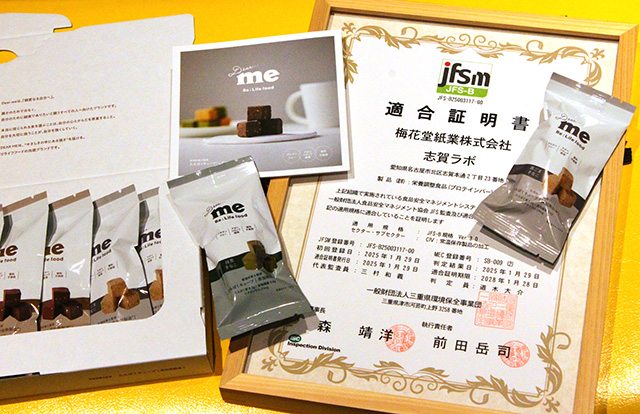 食品の安全衛生管理を徹底するため、JFS-B規格(HACCP)も取得し、誰かの“わたし”を守るための、やさしいひとくちのために『Dear me たんぱくキューブ』を開発しました」(梅花堂紙業 佐野博政 代表)