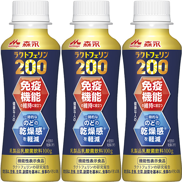 10月7日に全国で新発売した「森永ラクトフェリン200ドリンクタイプ」は、pDC(プラズマサイトイド樹状細胞)の働きを助け、健康な人の免疫機能の維持に役立つ機能や、健康な人の空気の乾燥にともなう一時的なのどの乾燥感を軽減する機能があることが報告されている「ラクトフェリン」を機能性関与成分としたドリンク。