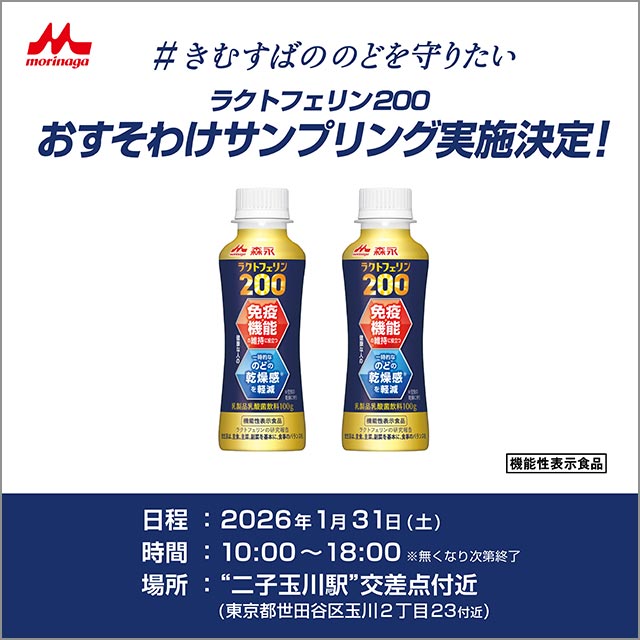そこで、木村昴と森永乳業は、「森永ラクトフェリン200ドリンクタイプ」を、みんなに体感してほしいという想いから、木村昴の“お裾分け”ぶんを加えた合計1万本(5,000セット)を、1月31日 10:00〜18:00 二子玉川駅(東急 田園都市線・大井町線)で無料配布!